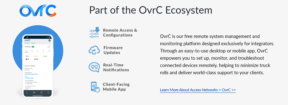 With Access Networks and OvrC, your customers can easily manage their wireless devices. Easy-to-setup user profiles allow parents and managers to schedule and restrict Wi-Fi access using the OvrC Connect app.