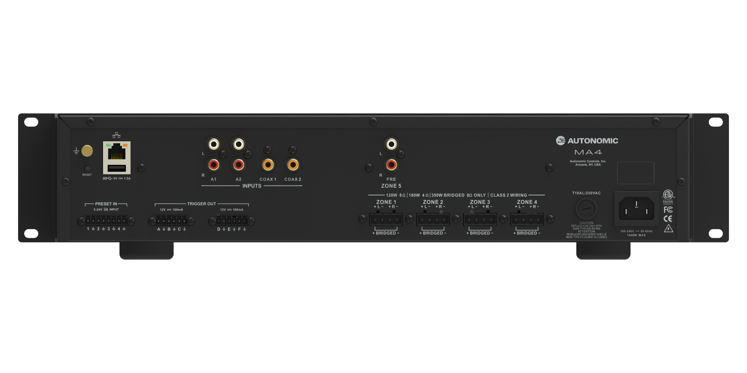 Large installations are no problem for Autonomic amplifiers, which can be bridged using any combination of MA6, MA4, and M-6250 amplifiers, up to 96 zones. Zone groups can be created to link multiple zones by tying the source selection together across the group. Zone linking can optionally coordinate volume and the power state of linked zones. The MA4 can route audio signals from any of its two discrete streams into any of its five zone outputs under manual control, or with IP based automation systems.