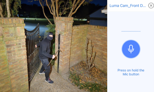 Is someone sneaking around your backyard? Let them know they're not welcome using the built-in microphone and speaker for two-way audio through the Luma View App.
