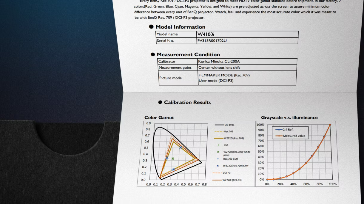 Individual factory calibration reports assure with100% DCI-P3, 100% Rec.709 Delta E<2 for true Hollywood colors.