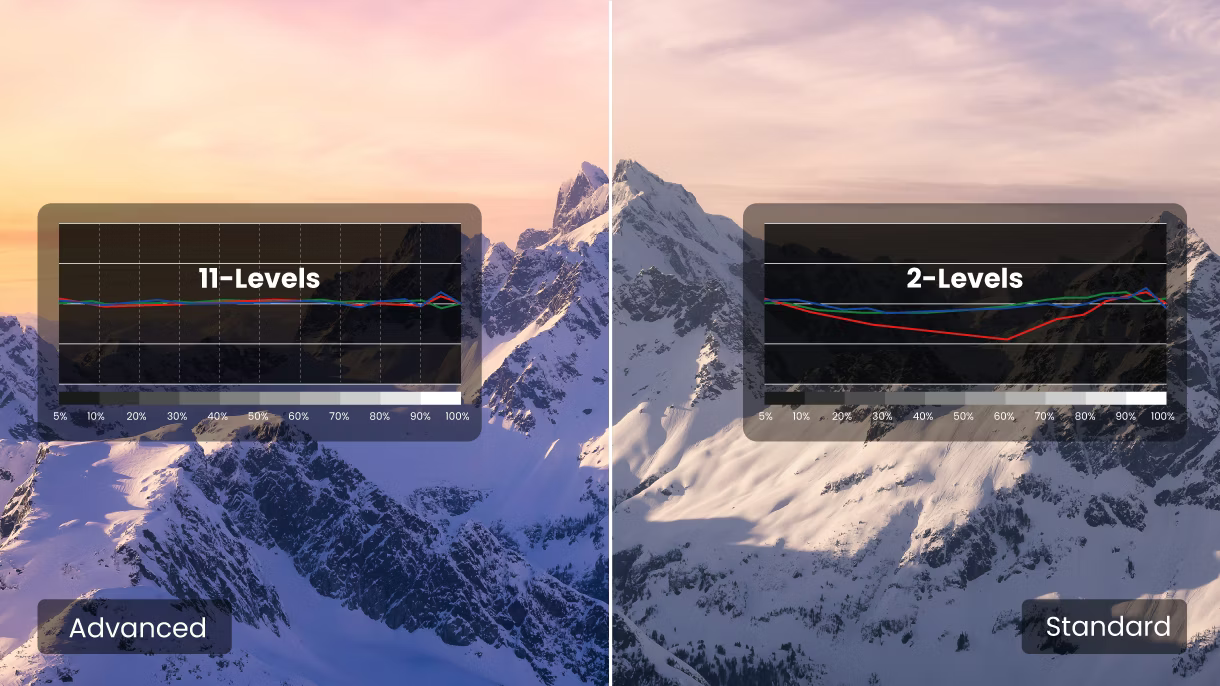 For ultimate color accuracy, BenQ high-end cinema projectors provide advanced color temperature tuning with 11 leading levels of white balance controls between high to low brightness, enabling content fanatics to adjust the most accurate mid-tone colors.