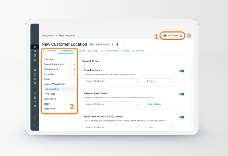 - New OvrC Categories: Consolidates Site Settings, Pro Tools, OvrC Pro Settings, as well as device and sub-system configuration and management to a single page. Technicians can switch between the old layout and the new consolidated Categories layout using the What's New toggle at the top right.
